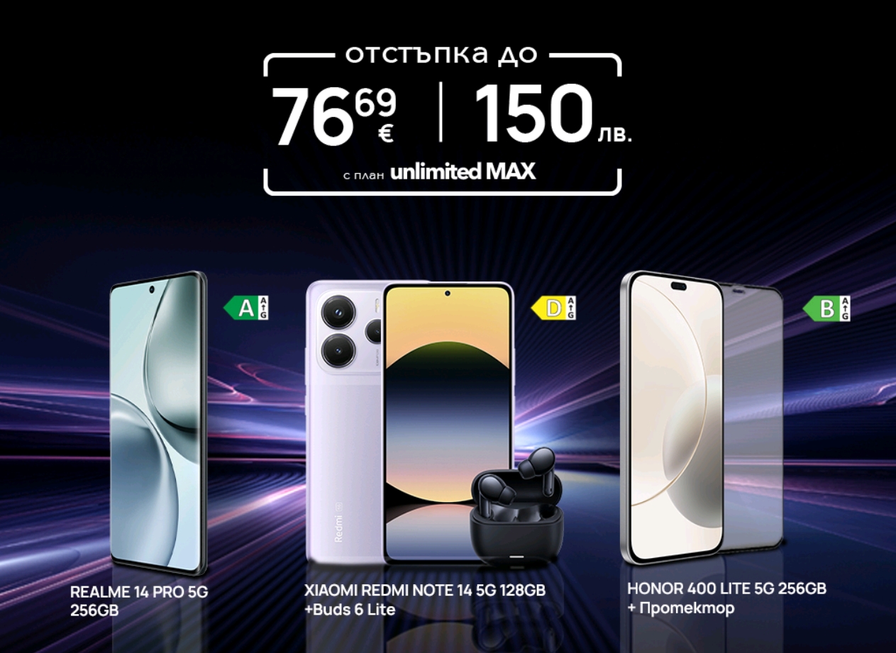 Vivacom предлага специални отстъпки до 76.69 € | 150 лв. за три от най-популярните 5G флагмани на пазара при покупка в комбинация с плановете Unlimited. Офертата е валидна до 31 август 2025 г. във всички магазини на телекома и онлайн на vivacom.bg.