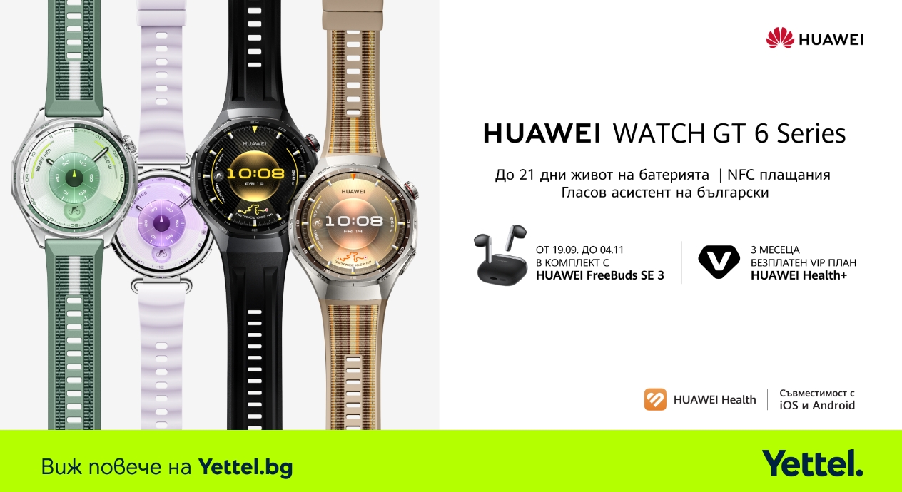 Най-новата серия смартчасовници на HUAWEI – Watch GT 6, вече е налична в търговската мрежа на Yettel. Новите модели са с впечатляващ живот на батерията – до 21 дни за Watch GT 6 (46 мм) и Watch GT 6 Pro, и до 14 дни за Watch GT 6 (41 мм). Устройствата предлагат прецизен GPS, възможност за NFC плащания и широк набор от функции за спорт и здраве, включително тренировки с гласов асистент на български език. Pro версията се отличава със сапфирен кристал предпазващ дисплея, корпус от титаниева сплав, ЕКГ функция и усъвършенстван сърдечно-съдов мониторинг.