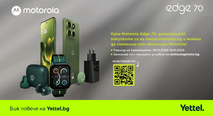 Yettel дава начало на продажбите на най-новия стилен модел на Motorola – Edge 70 5G. Моделът се отличава със своят ултратънък корпус, елегантен, но издръжлив дизайн, както и много добра система от камери.  Всеки, който се сдобие със смартфона до 19 ноември, може да се регистрира в томбола за сет аксесоари от Motorola на https://motorolapromo.bg/. Сред аксесоарите са смартчасовник Moto Watch Fit, безжични слушалки Moto Buds Loop, адаптер за зареждане Motorola 68W TurboPower и таг за проследяване Moto Tag.
